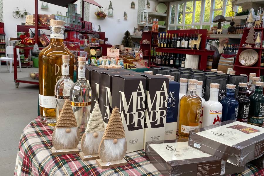 E poi – si sa – lo shop di Linea Verde Nicolini ha anche quell’angolo così caldo e pieno di ritmo: l’angolo enoteca&goloserie, in cui il registro sensoriale diventa come una musica coinvolgente.
